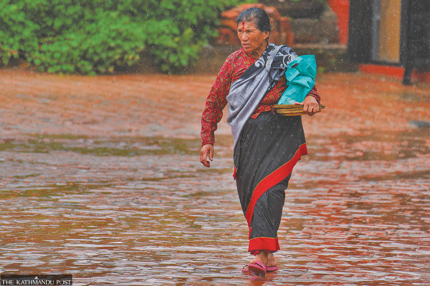 An elderly woman in traditional dress navigates the rain-soaked paths of Bhaktapur Durbar Square in this recent photo. Safal Prakash Shrestha/ TKP