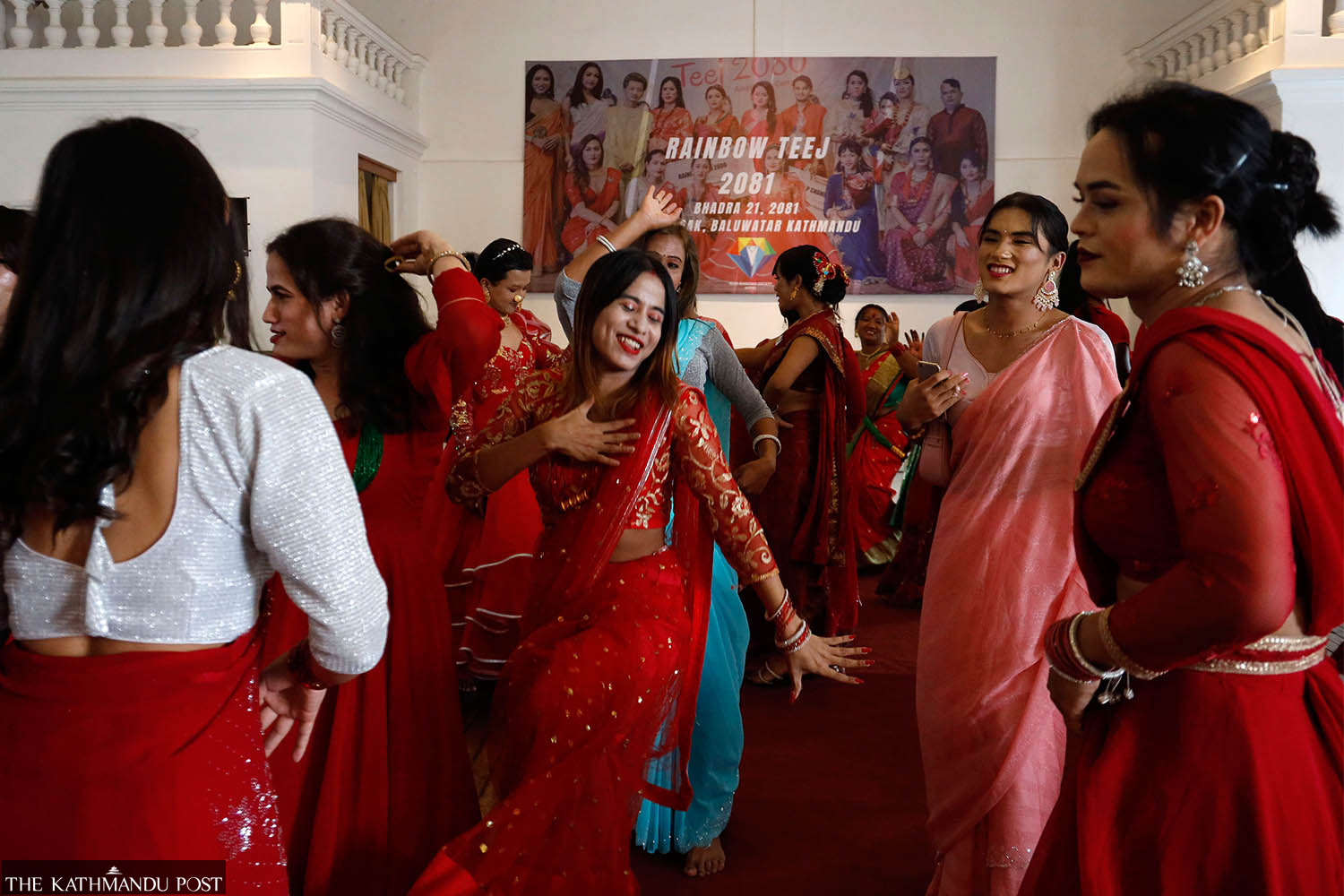 Members of the queer community celebrate Teej at Baluwatar in Kathmandu on Friday. Hemanta Shrestha/TKP