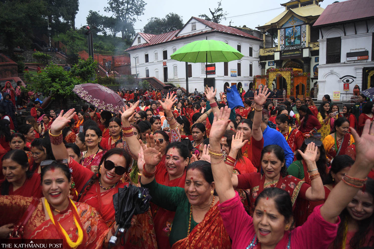 Women observing Teej fast pictured in the Pashupatinath temple area in Kathmandu on Friday. Teej is celebrated mainly by Hindu women, wishing for personal and family well-being. Safal Prakash Shrestha/TKP
