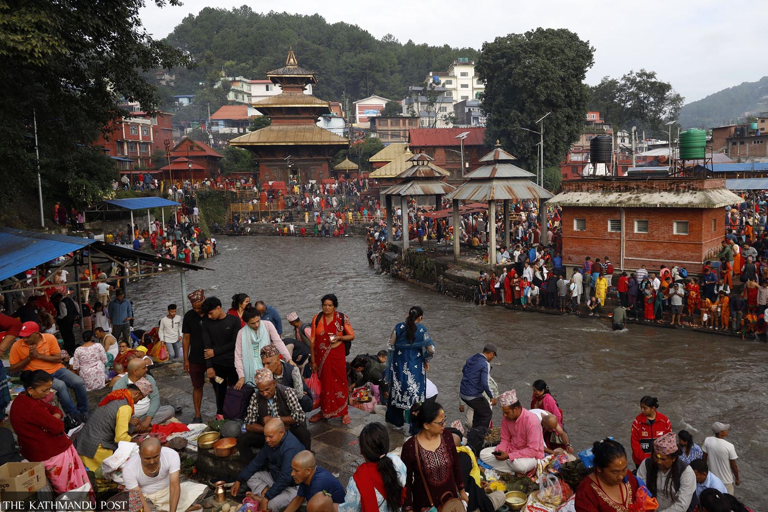Devotees perform pooja on the occasion of Kuse Aunsi at Gokarneshwar in Kathmandu on Monday. On this day, Hindus offer respects to their fathers dead and alive. Hemanta Shrestha/TKP