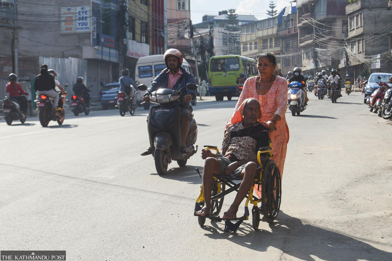A woman pushes a man on a wheelchair along the main road at Ravibhawan in Kathmandu on Sunday. Safal Prakash Shrestha/ TKP