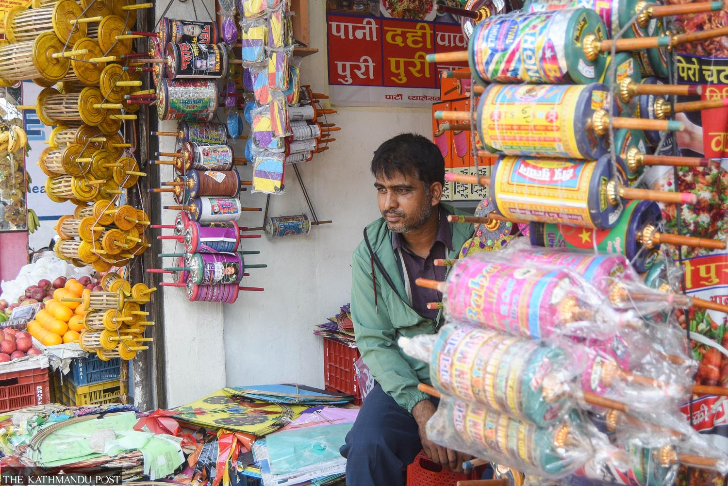 A kite seller waits for customers at Kalimati in Kathmandu on Sunday. With clear skies and moderate temperatures, the autumn festival season of Dashain, Tihar and Chhath is suitable for kite flying in Nepal. Safal Prakash Shrestha/ TKP