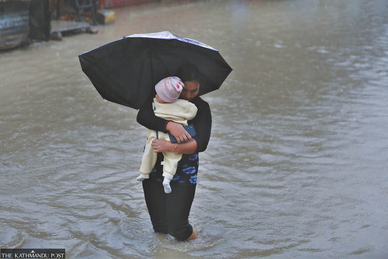 A woman wades through a waterlogged way with her baby in the Kuleshwar area of Kathmandu after a day of heavy rains in the Valley on Friday. Post Photo