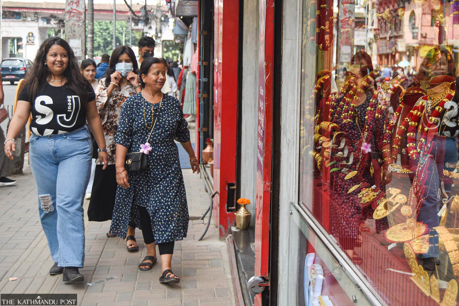 People walk past a jewellery shop at New Road in Kathmandu. At Rs159,700 a tola, gold prices hit a new high on Tuesday. Safal Prakash Shrestha/ TKP