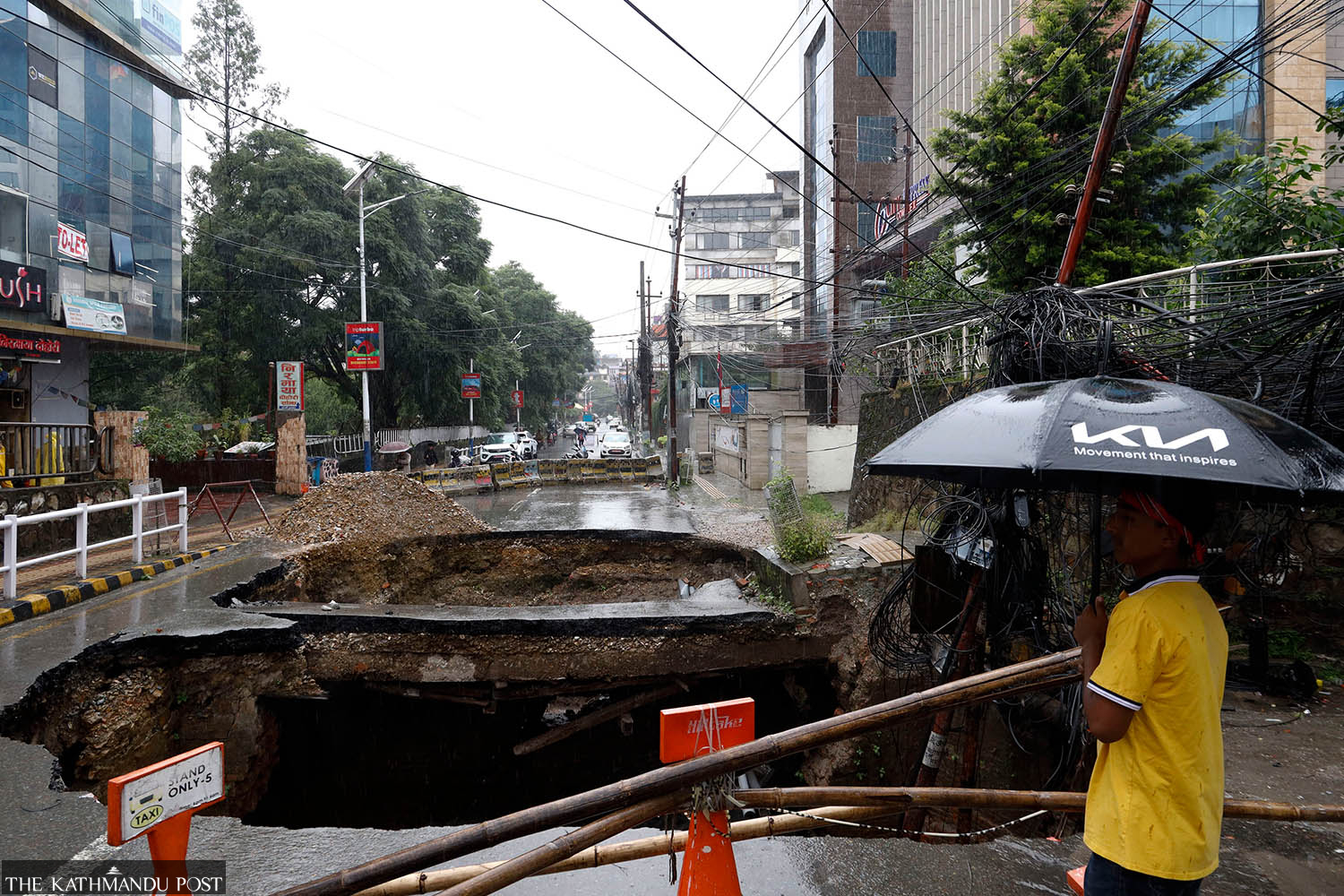 A man looks at the hole on the Putalisadak-Kamaladi road that caved in on August 9. The authorities have yet to repair the damaged road in the Capital. Hemanta Shrestha/TKP
