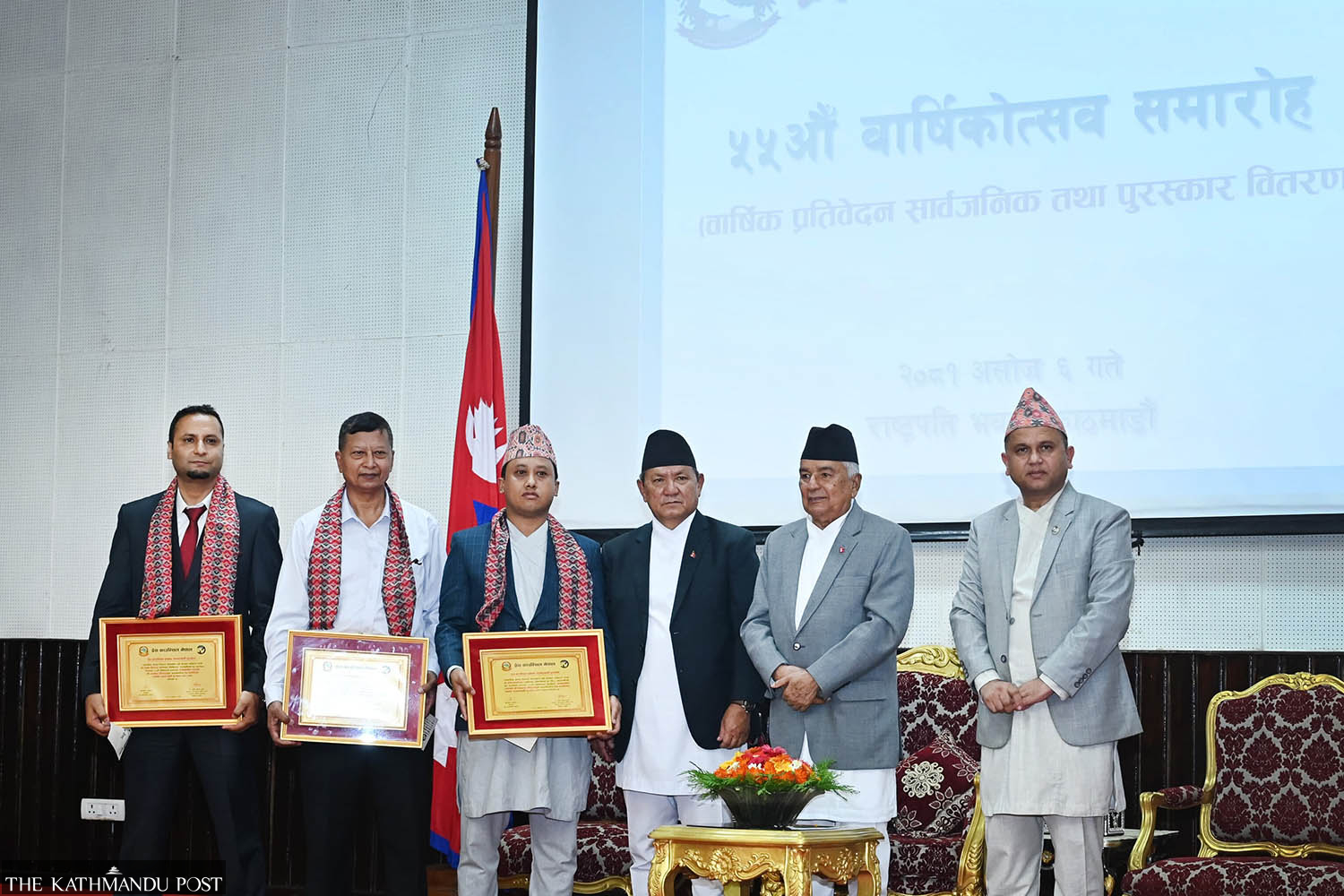 Recipients of the Press Council Vibrant Journalism Award at President’s Office, Sheetal Niwas, Sunday. (From left) Post photojournalist Prakash Chandra Timilsena, Kantipur TV video journalist Shyam Shrestha, Kantipur reporter Hom Karki, communications minister Prithvi Subba Gurung, President Ramchandra Paudel and Press Council chair Balkrishna Basnet. Post Photo