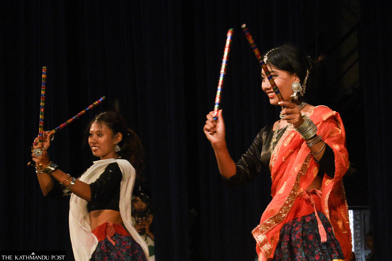 Tharu women perform a stick dance as the community celebrates Jitiya Parva, at Naach Ghar in Kathmandu on Wednesday. Safal Prakash Shrestha/ TKP
