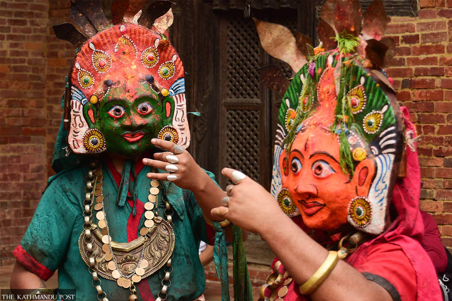 Masked devotees from Thecho perform the Navadurga dance at Mulchowk in Patan Durbar Square on Thursday, on the occasion of Kojagrat Purnima, the last day of the Dashain festival. This performance celebrates Durga, the principal goddess of Dashain, and her nine forms. Safal Prakash Shrestha/TKP