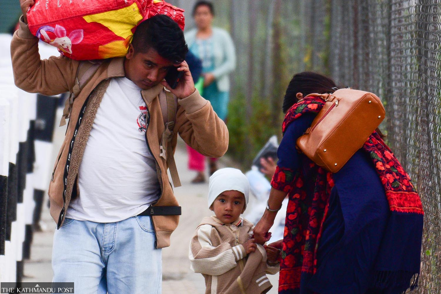 A family returning to Kathmandu after celebrating Dashain festival at their village, pictured in Koteshwar, Kathmandu on Tuesday. Safal Prakash Shrestha/TKP