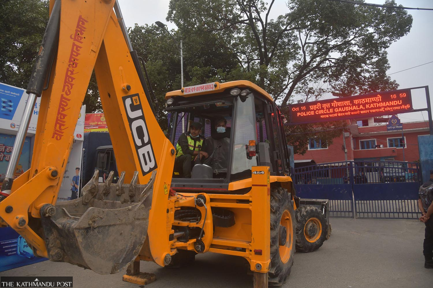 A backhoe deployed by Kathmandu Metropolitan City to seize control of Gaushala Dharmashala property from Marwadi Sewa Samiti sits idle. Deepak KC/TKP