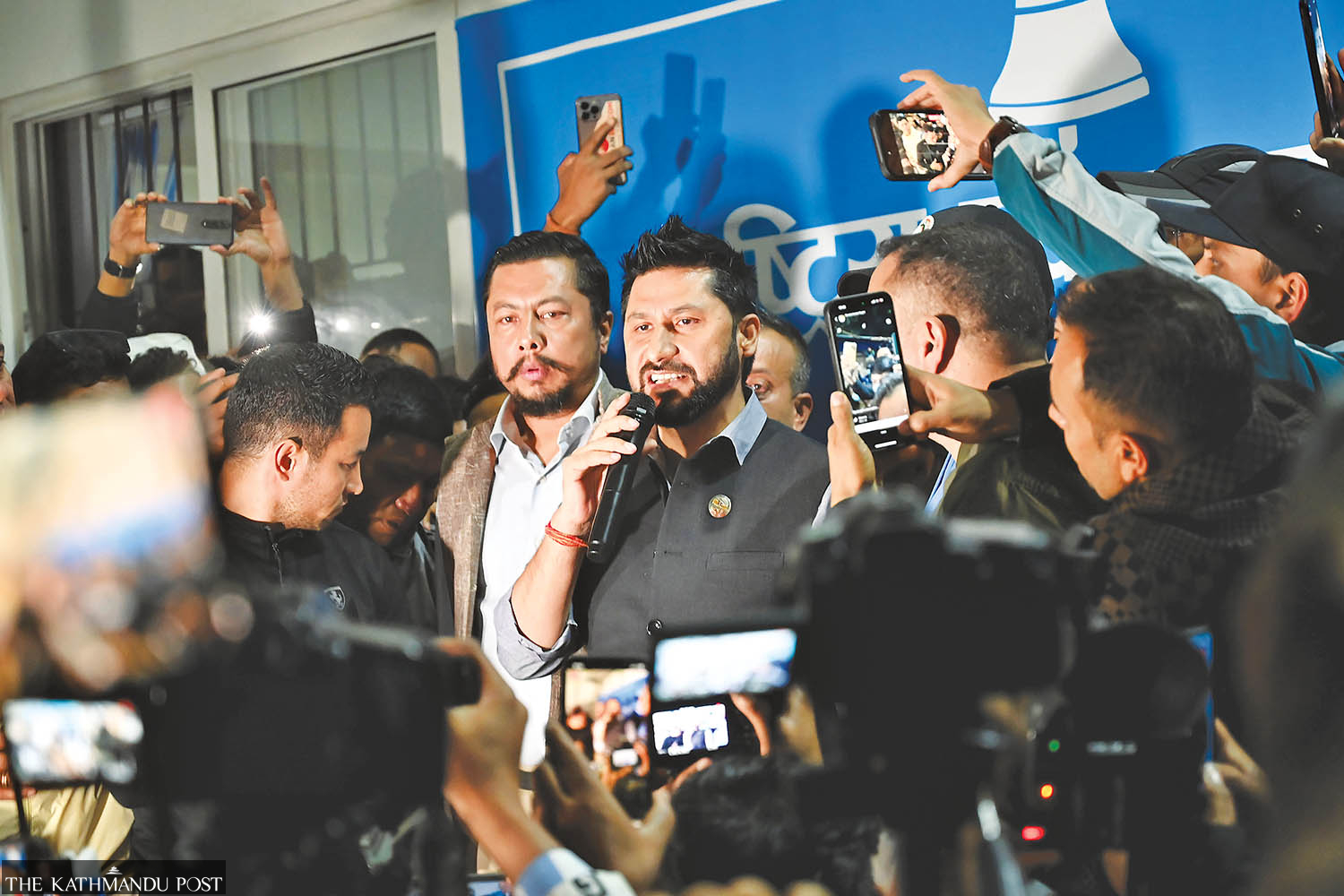 RSP chief Rabi Lamichhane speaks to media at his party headquarters in Banasthali, Kathmandu before his arrest on Friday evening. Angad Dhakal/TKP
