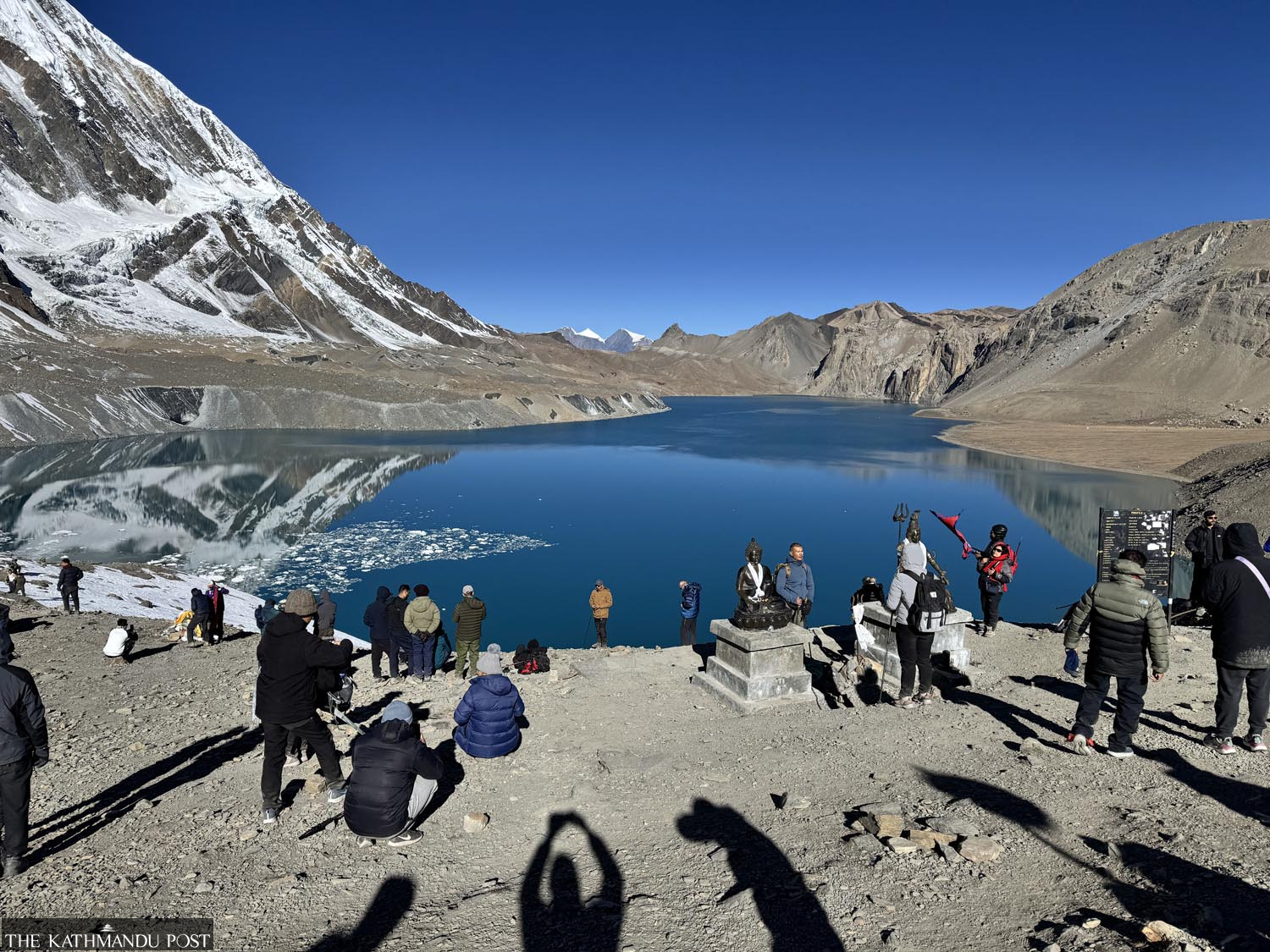 Tourists pictured at Tilicho Lake in Manang last week. A hotelier at the Tilicho Base Camp says most of the visitors to the lake, located at an elevation of 4,919 metres, are domestic travellers in the Dashain-Tihar-Chhath festive season. Madhab Aryal/TKP