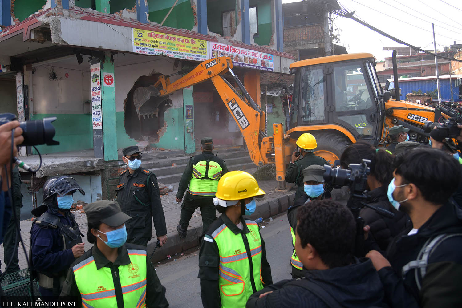 City police deployed by the Kathmandu metropolis tear down structures that encroach on public land at Gaushala, Kathmandu on Friday. The city office had earlier issued a notice asking the owners to dismantle the illegal portions and clear the area. City police said they had to take action as the people didn’t abide by the notice. Deepak KC/TKP