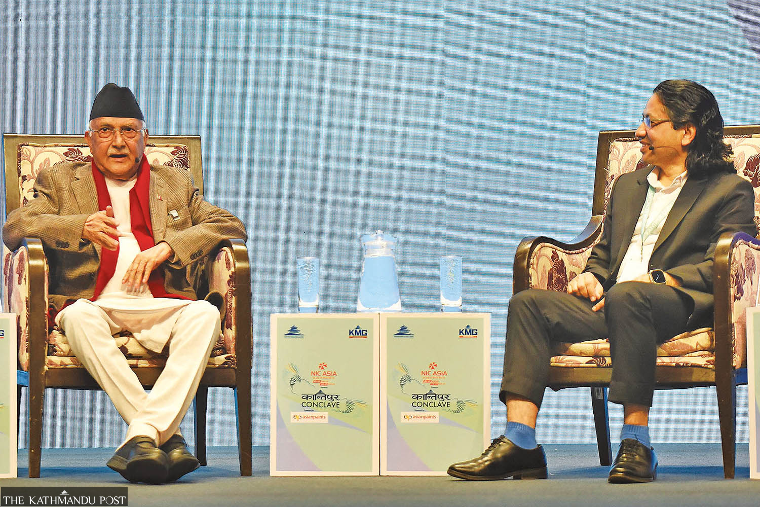 Prime Minister KP Sharma Oli (left) in conversation with Kantipur Editor-in-Chief Umesh Chauhan at the Kantipur Conclave on Thursday. Angad Dhakal/TKP