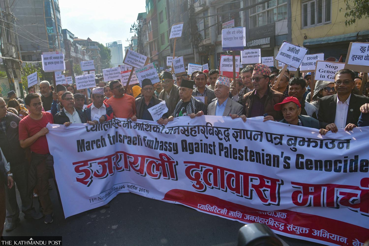 Leaders and supporters of several leftist parties, along with members of civil society, demonstrate at Ratnapark, Kathmandu, on Monday against Israel’s killing of Palestinians. Their attempt to march to the Israeli Embassy in Lazimpat and submit a memorandum to the ambassador was thwarted by the police. Deepak KC/TKP