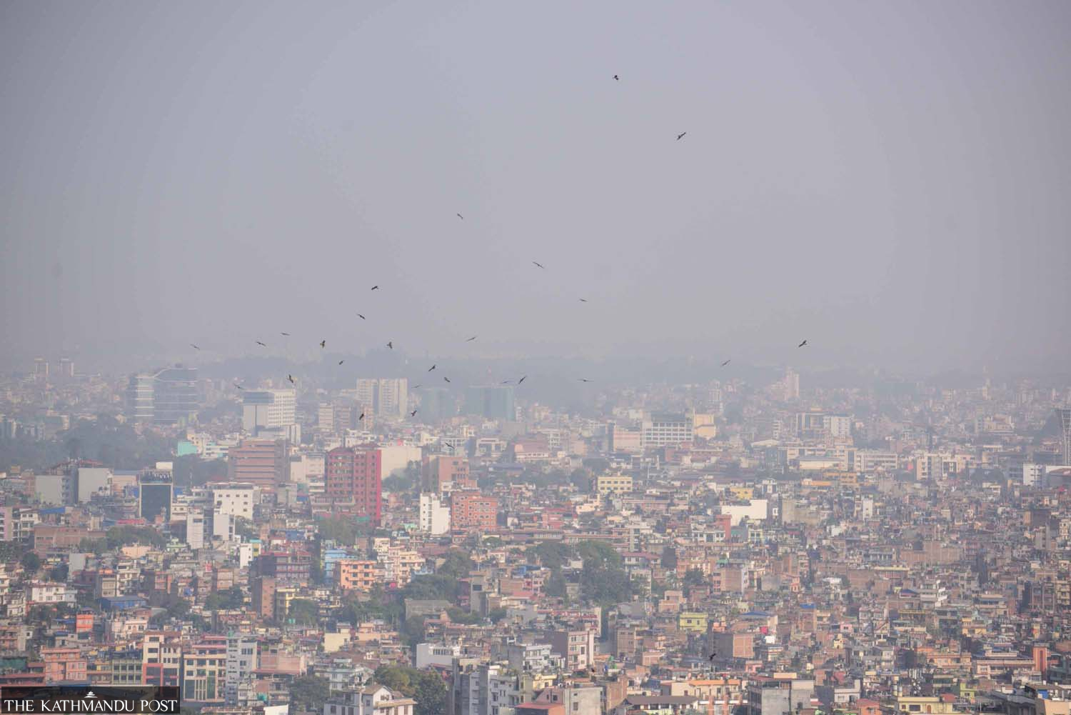 Birds fly in a hazy Kathmandu sky in this view from Swayambhunath on Wednesday. Pollution level in the Capital has been rising in recent days. Safal Prakash Shrestha/ TKP