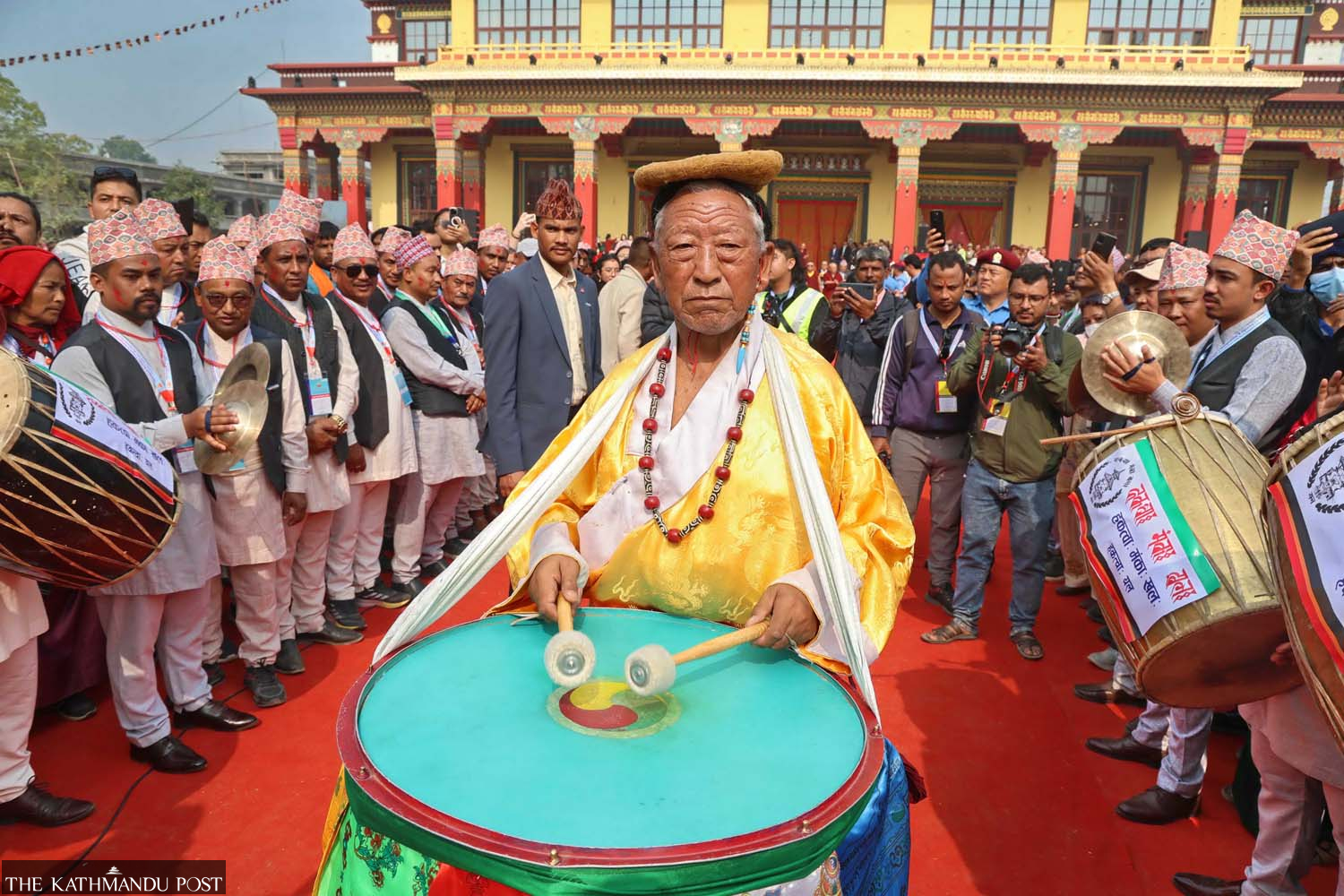 Sherpa community members play instruments as they stage the popular Tashi Sholpa dance in Lumbini on Friday. Manoj Paudel/TKP