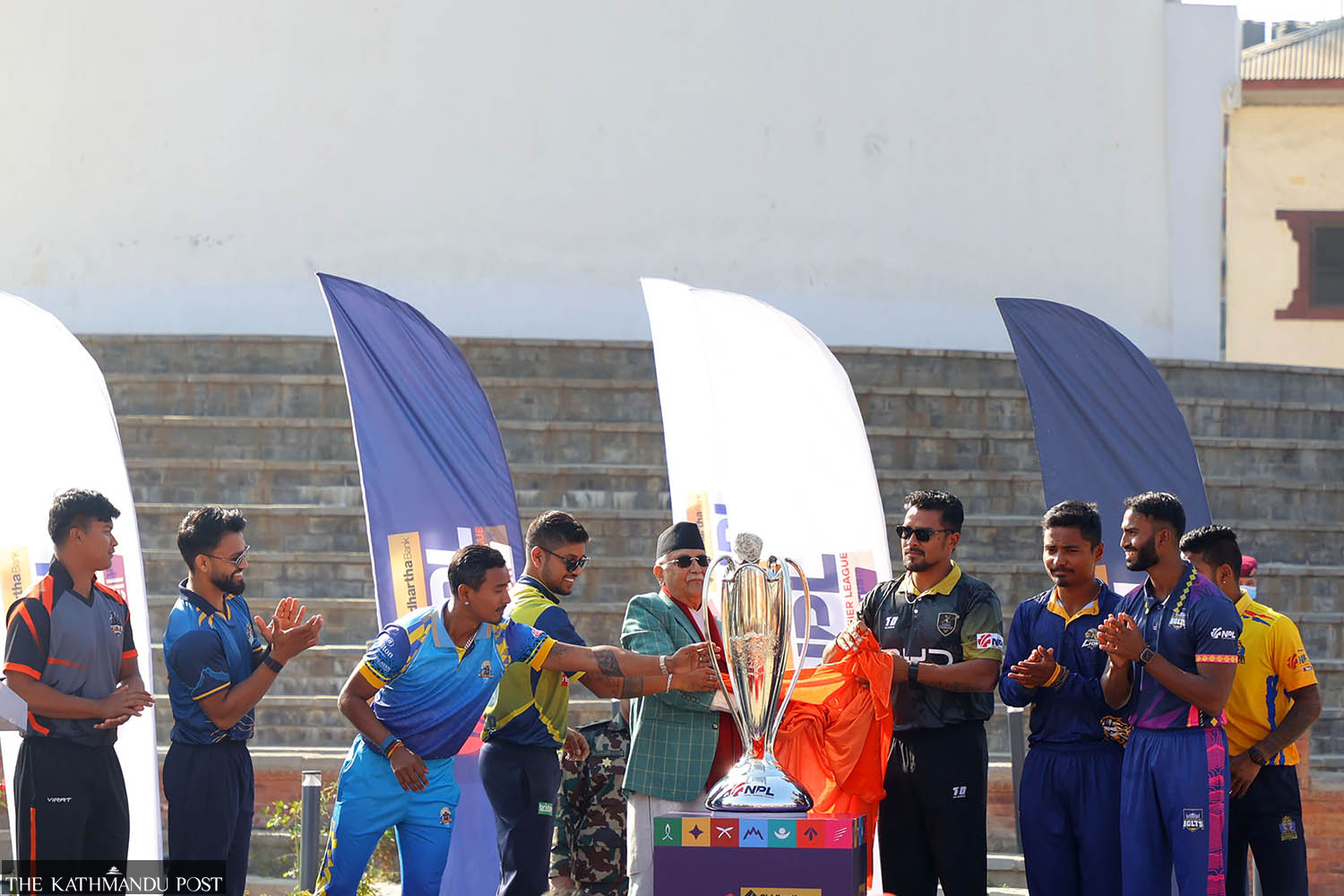 Prime Minister KP Sharma Oli (centre) and marquee players of the eight participating teams unveil the trophy of the Nepal Premier League (NPL) T20 cricket tournament amid a function on Dharahara premises in Kathmandu on Monday. According to Cricket Association of Nepal (CAN), a stone from Kala Patthar, a major landmark in the Everest region, has been set on the top of the trophy to signify the importance of environment protection. The inaugural edition of the NPL will begin on November 30 at the TU Cricket Ground in Kirtipur. Hemanta Shrestha/TKP