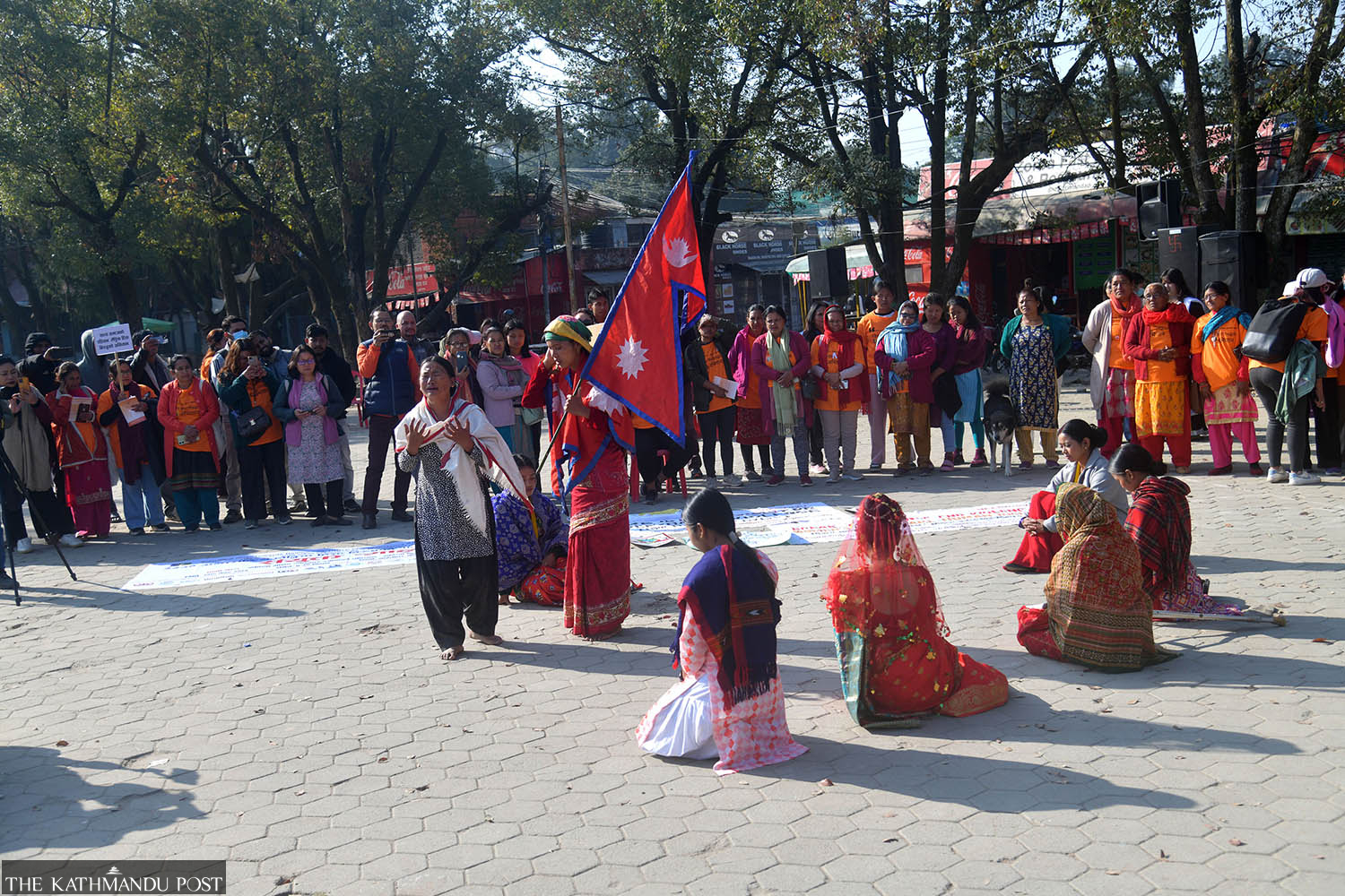 Artists and activists stage a street play at Bhrikutimandap in Kathmandu to raise awareness at the launch of the international 16-day campaign against gender-based violence, on Monday. Deepak KC/TKP