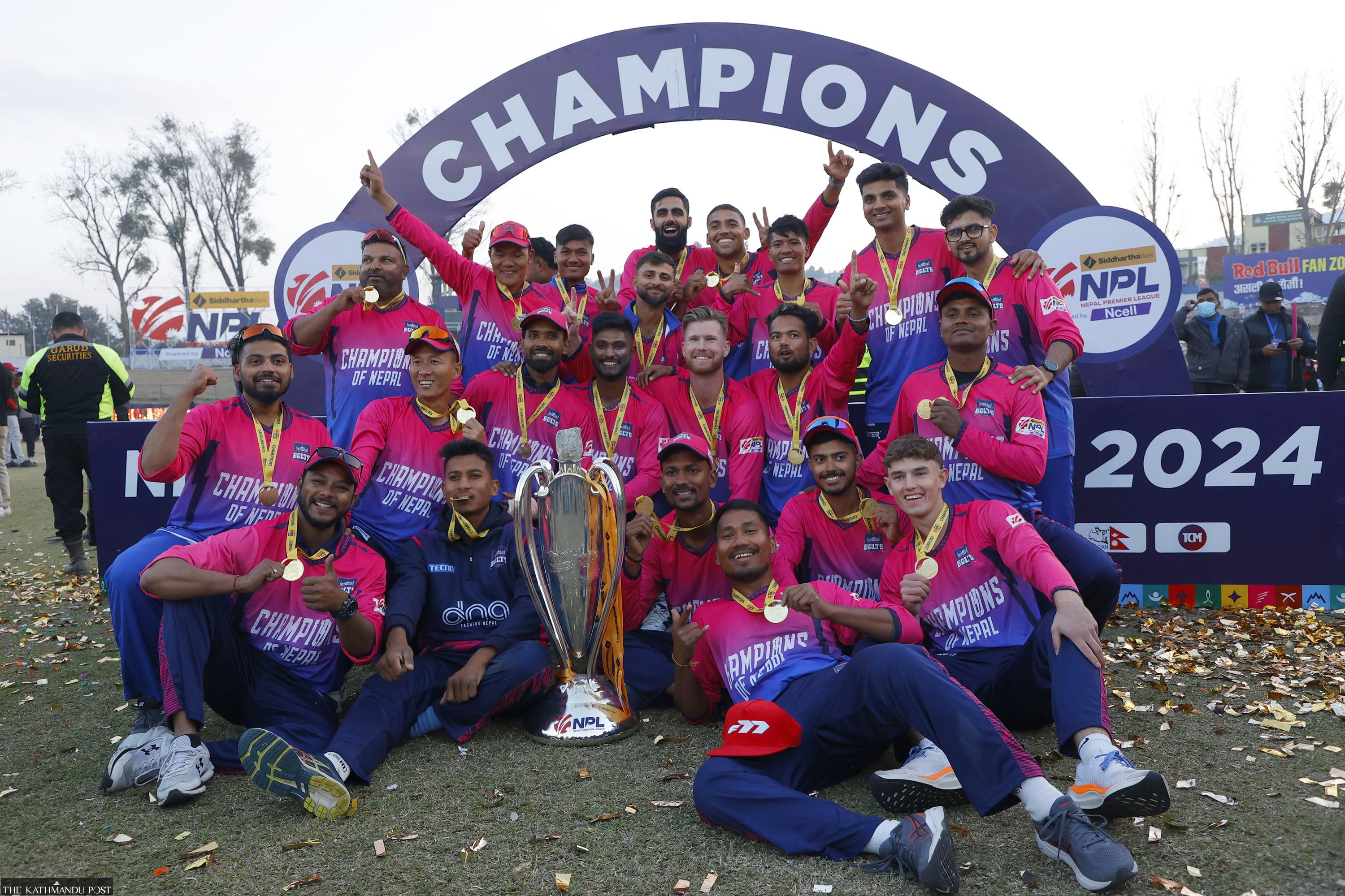 Janakpur Bolts celebrate after defeating Sudurpaschim Royals in the final of the Nepal Premier League T20 cricket tournament at the TU Cricket Ground in Kirtipur on Saturday. Hemanta Shrestha/TKP