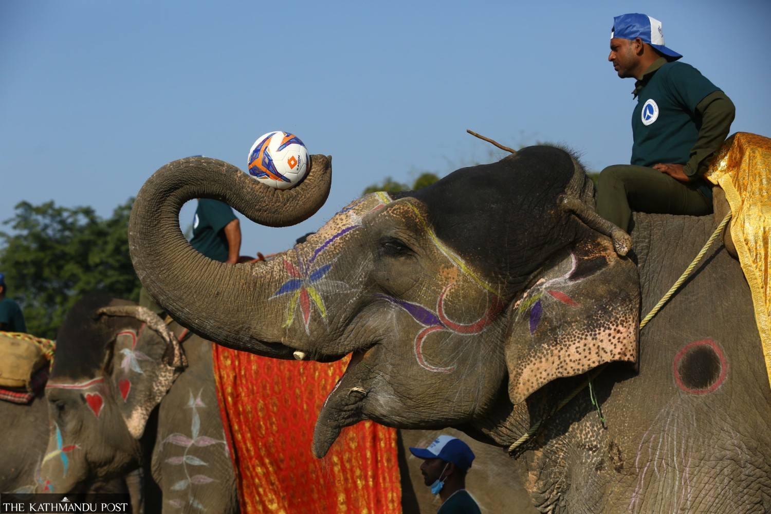 An elephant performs a trick during the ongoing elephant and tourism festival at Sauraha in Chitwan, on Friday. Prakash Chandra Timilsena/TKP