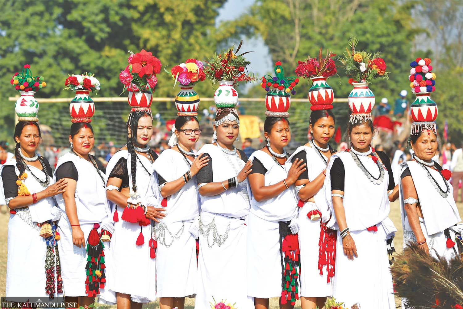 Tharu women stage a cultural show during the launch of a six-day elephant and tourism festival at Sauraha in Chitwan on Thursday. Prakash Chandra Timilsena/TKP