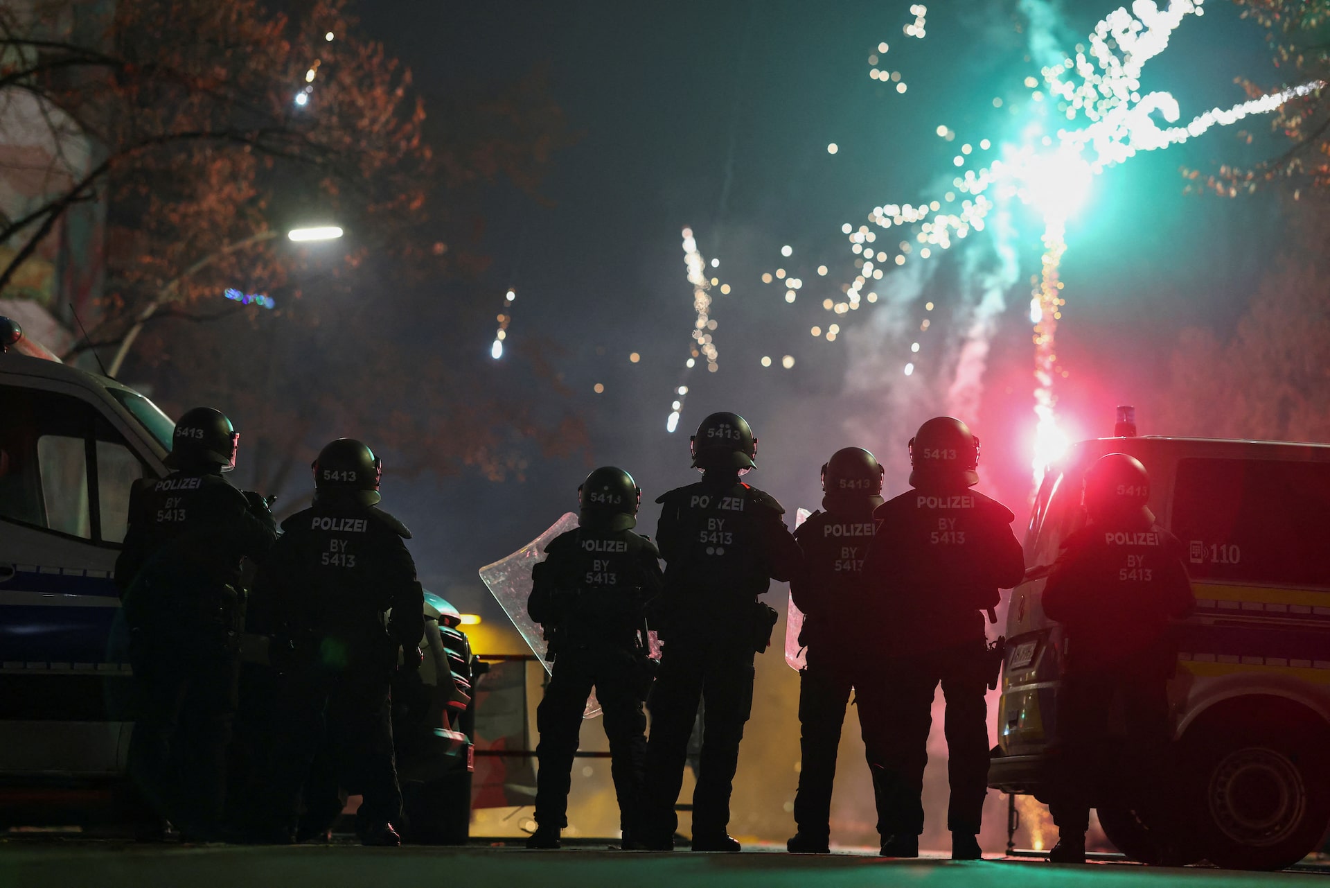 Police officers stand guard as fireworks burst during New Year's celebrations in Berlin, Germany, January 1. Reuters