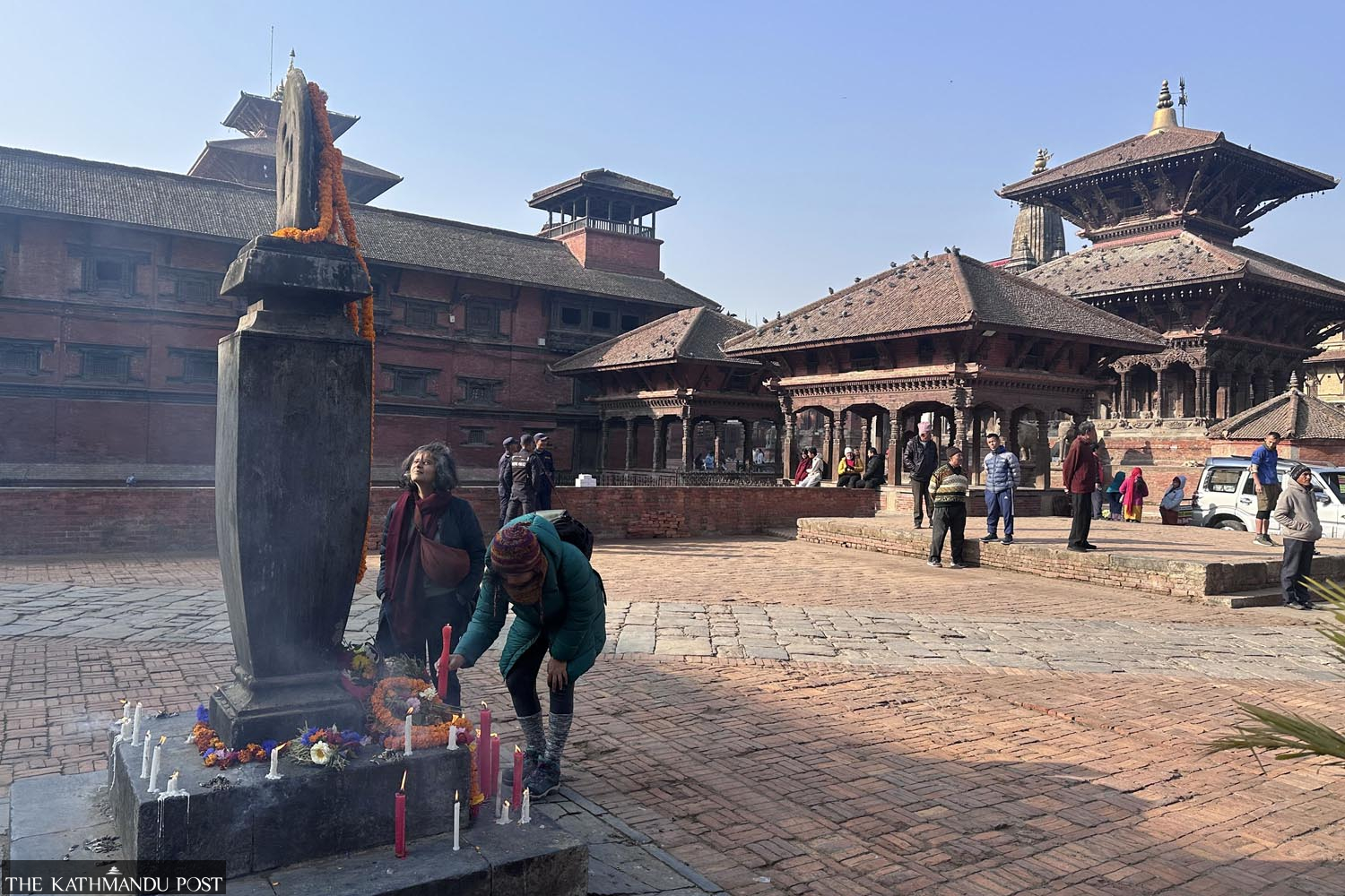 People look at a memorial of the devastating 1934 earthquake, at Patan Durbar Square in Lalitpur, on Wednesday. Hemanta Shrestha/TKP