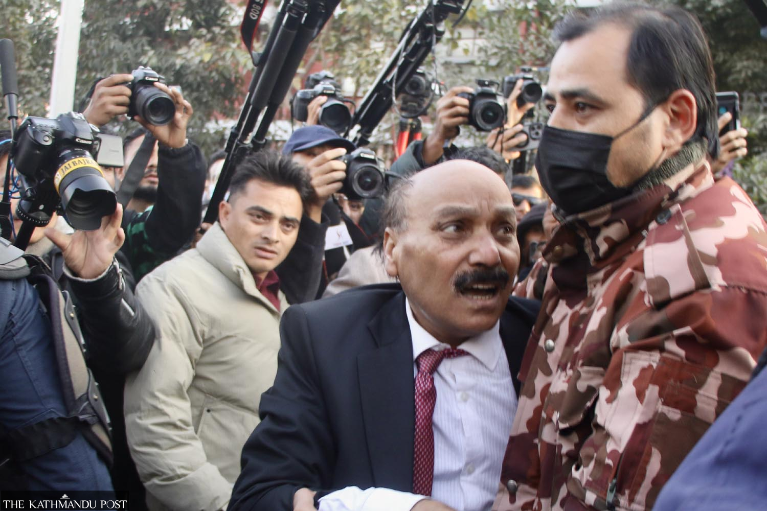 Lawyer Dinesh Tripathi (second right) appears panicked after supporters of Rastriya Swatantra Party attempted to assault him at Kathmandu District Court, Wednesday. Hemanta Shrestha/TKP