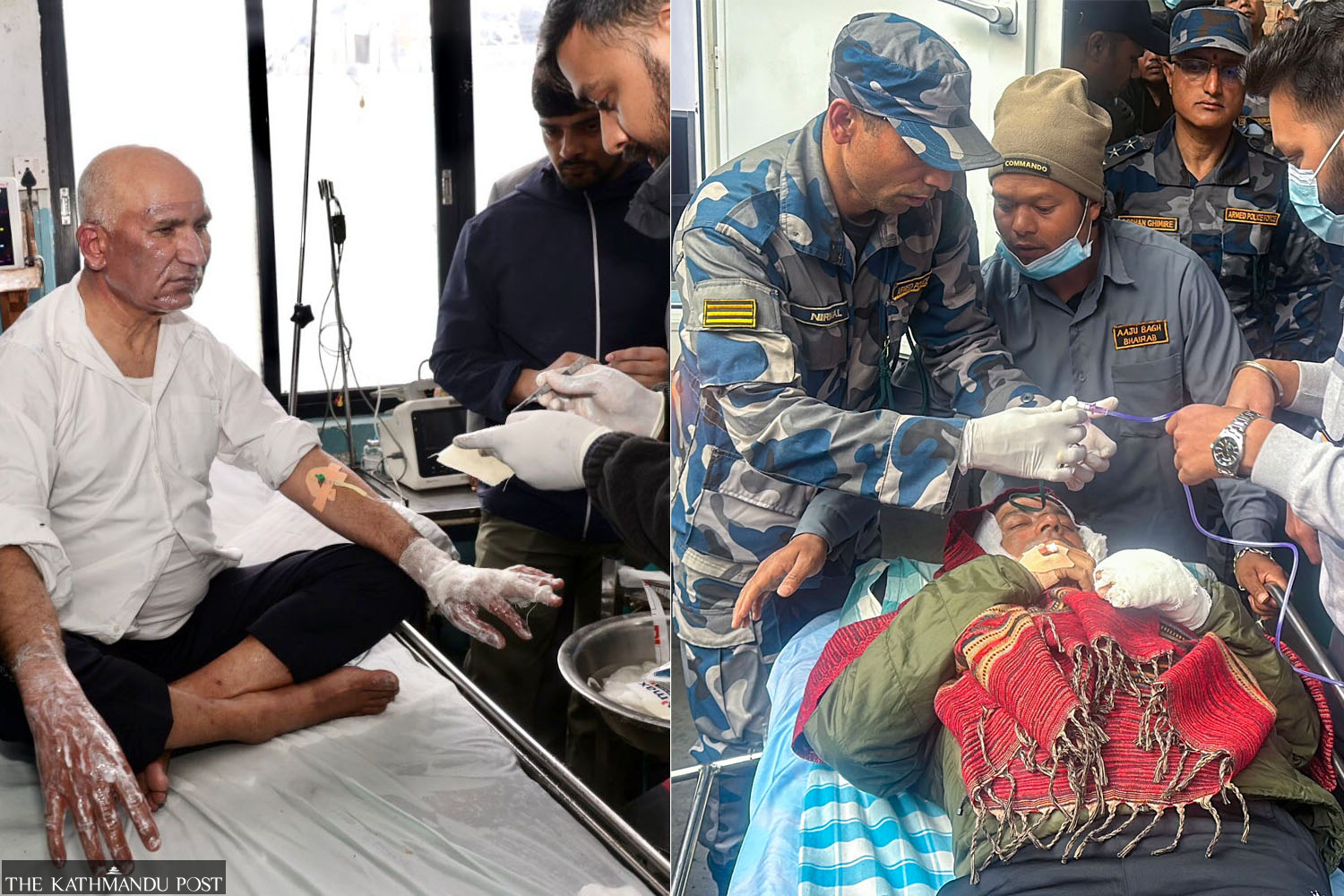 Finance Minister Bishnu Paudel (left) and Pokhara Mayor Dhana Raj Acharya being attended by medics at Kirtipur Hospital in Kathmandu on Saturday after they sustained burns while inaugurating the Pokhara Visit Year 2025 in Kaski earlier in the day. Bibek Pokhrel/TKP
