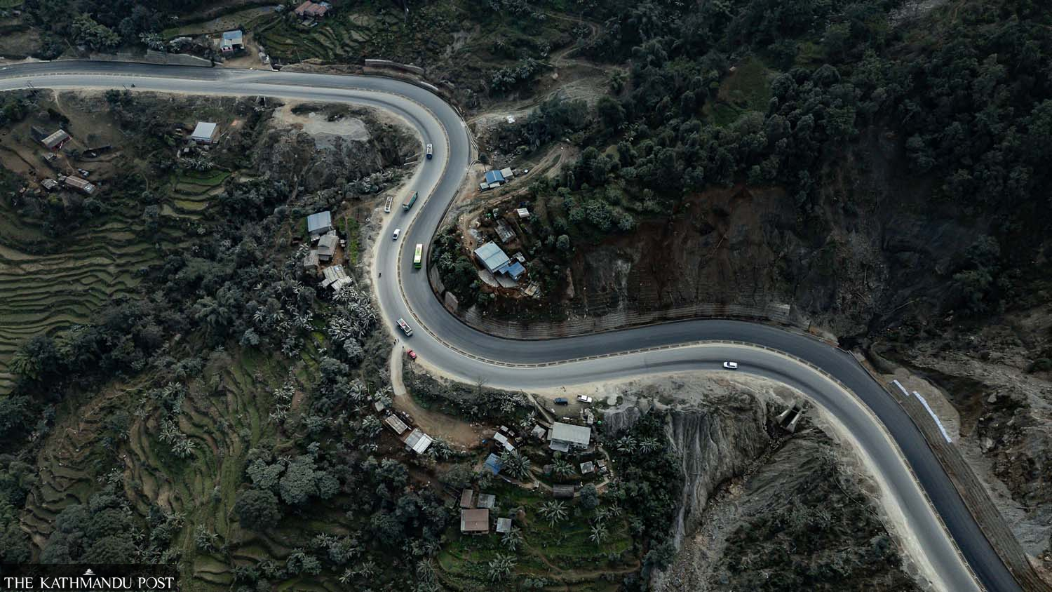 A recent aerial view of the under-construction Muglin-Pokhara road near Damauli, Tanahun. Hemanta Shrestha/TKP