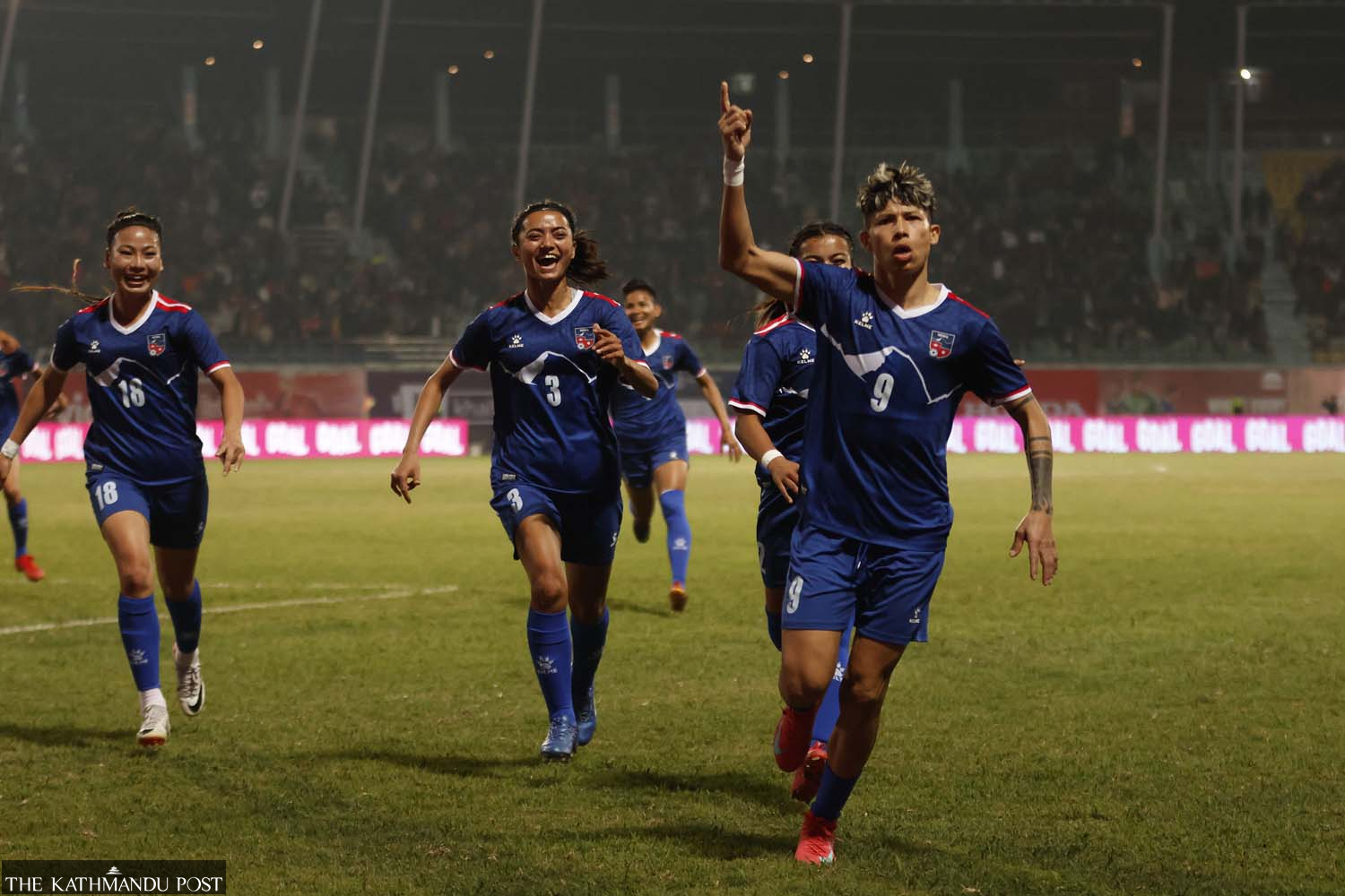 Sabita Rana Magar (18), Bimala BK (3) and Sabitra Bhandari ‘Samba’ (9), among other Nepali footballers, celebrate a goal against Lebanon during the four-nations women international football championship at Dasharath Stadium in Kathmandu on Thursday. Hemanta Shrestha/TKP