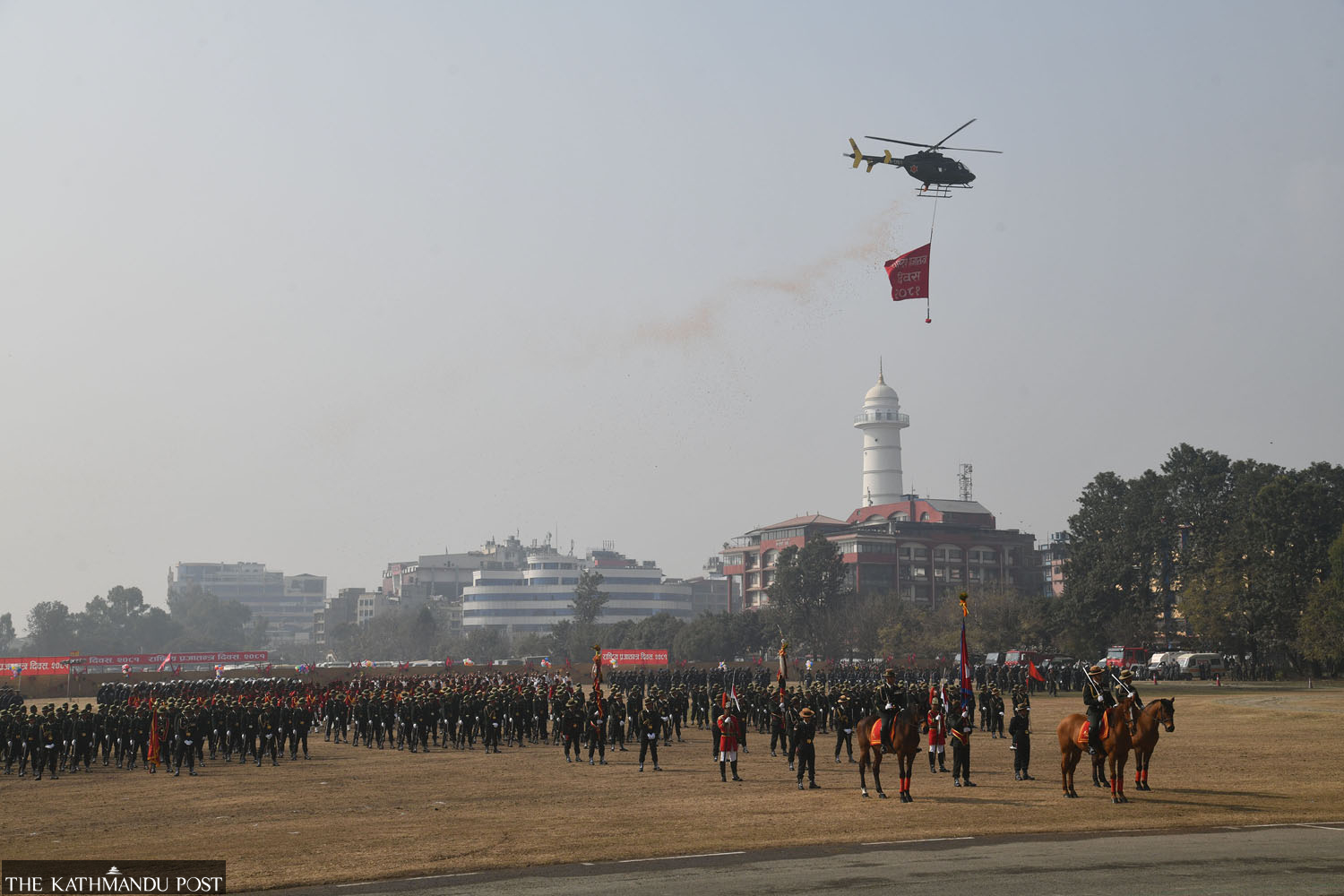 An army chopper flying a banner showers flowers as soldiers prepare to parade on Tundikhel to mark Democracy Day, in Kathmandu, Wednesday. Deepak KC/TKP