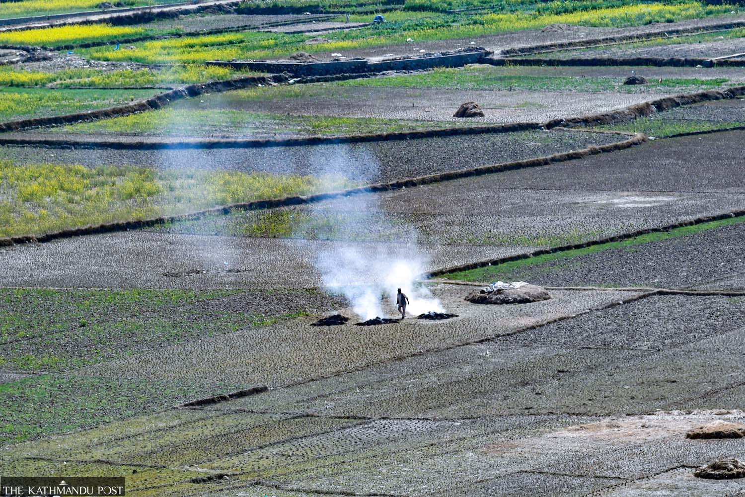 A farmer in Khokana, Lalitpur burns stubbles and other remains to use the ash as fertiliser, earlier this month. Deepak KC/TKP