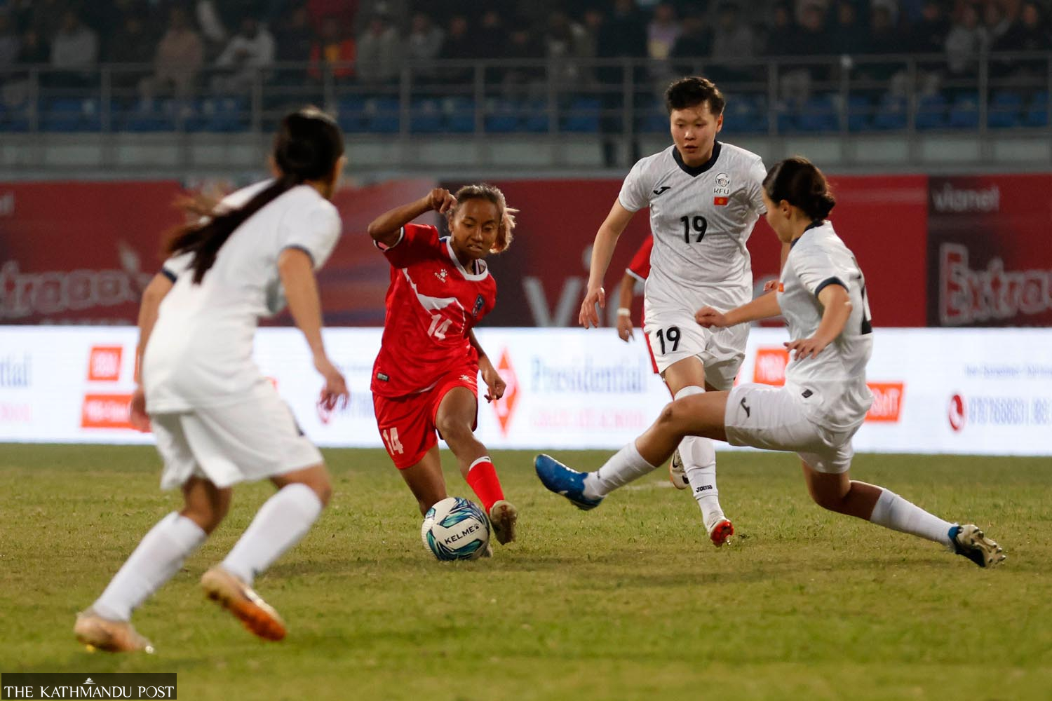 Nepal’s Preeti Rai (in red) dominates possession as Kyrgyzstan players close in during their International Women’s Championship football match at the Dasharath Stadium, in Kathmandu, on Monday. Bimala Chaudhary’s early header secured Nepal’s 1-0 victory. Hemanta Shrestha/TKP