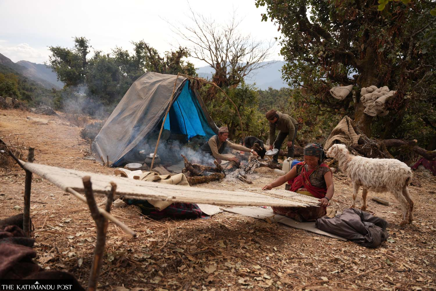 A woman works on a handloom weaving yarn into rugs as other sheep herders set up their camp near Thuli Daha in Musikot-7 of Rukum West in this recent photo, having brought their animals to lower climes from cold upper regions. Most farmers in the district are engaged in agriculture. Mahesh KC/TKP