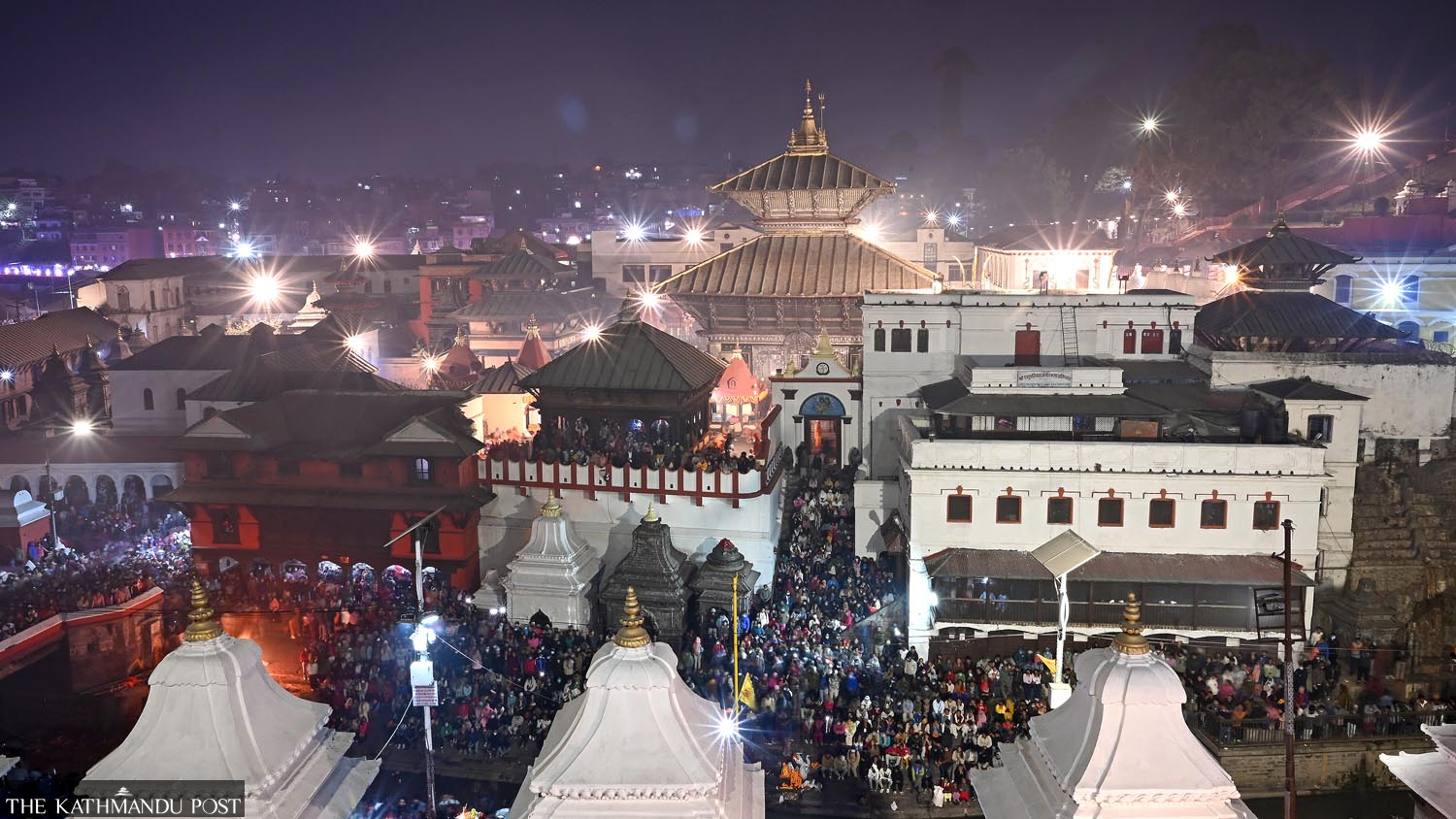 Crowds of devotees line the Bagmati riverbanks on Tuesday evening for the daily Arati (evening worship) in front of the Pashupatinath Temple, on the eve of the Mahashivaratri festival. The temple complex has been lavishly decorated for the grandest festival dedicated to Lord Shiva. Angad Dhakal/TKP
