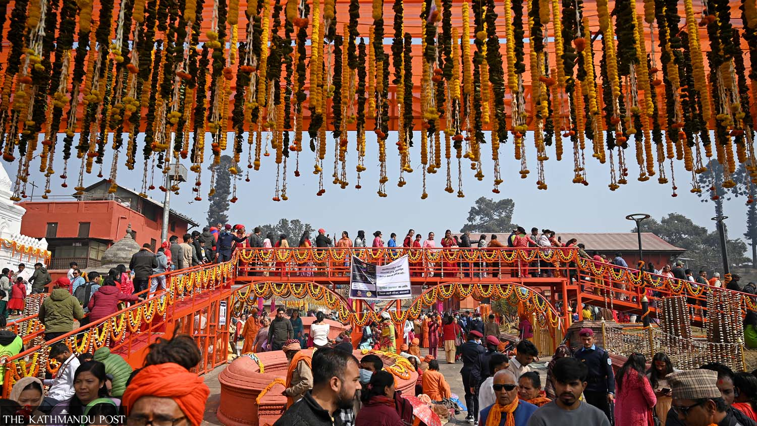 Devotees pictured amid floral decorations on the Pashupati premises as they make their way to the temple to offer Shivaratri prayers, in Kathmandu on Wednesday. Angad Dhakal/TKP