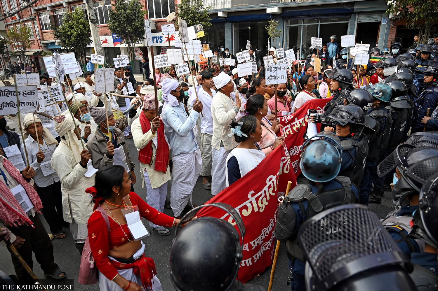Tenant farmers from Dang face police at New Baneshwar as they march towards the federal parliament building through a prohibited area, in Kathmandu on Tuesday. Farmers tilling the land owned by Swargadwari Ashram Trust in Dang have been staging an indefinite sit-in for over three weeks at Maitighar demanding law to secure their land right. Angad Dhakal/TKP