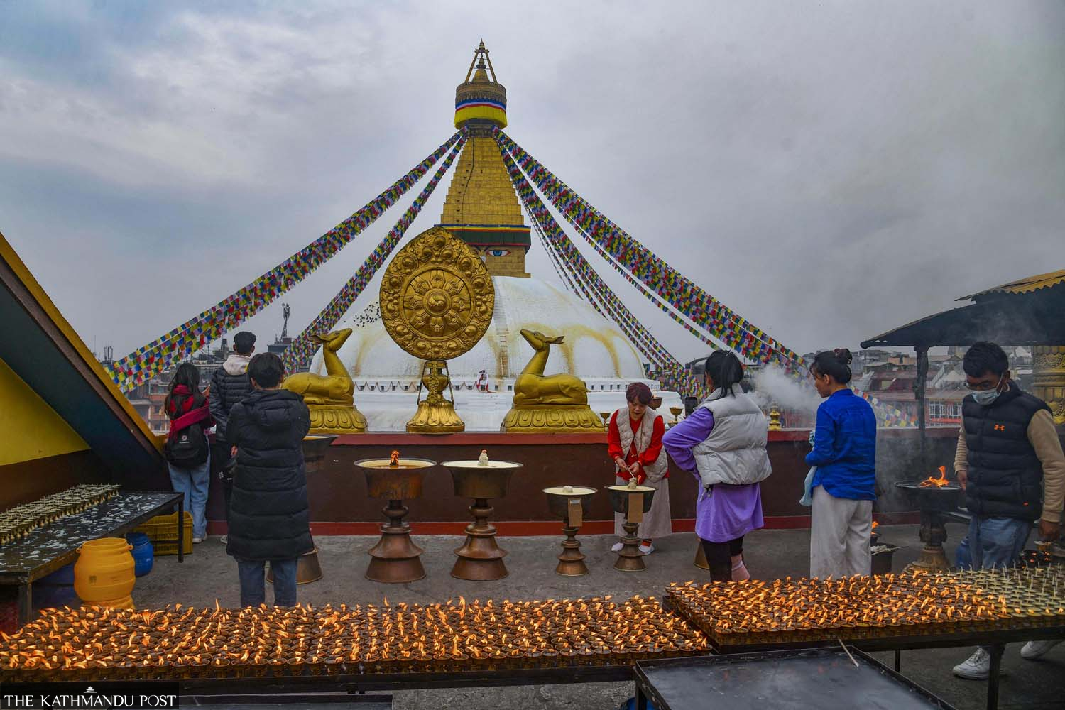 Devotees light oil lamps at Bauddha Stupa in Kathmandu on the occasion of Gyalpo Lhosar on Friday. The New Year celebrated by the Sherpa community calls for unity, cultural solidarity, goodwill and brotherhood among the Nepalis. Deepak KC/TKP
