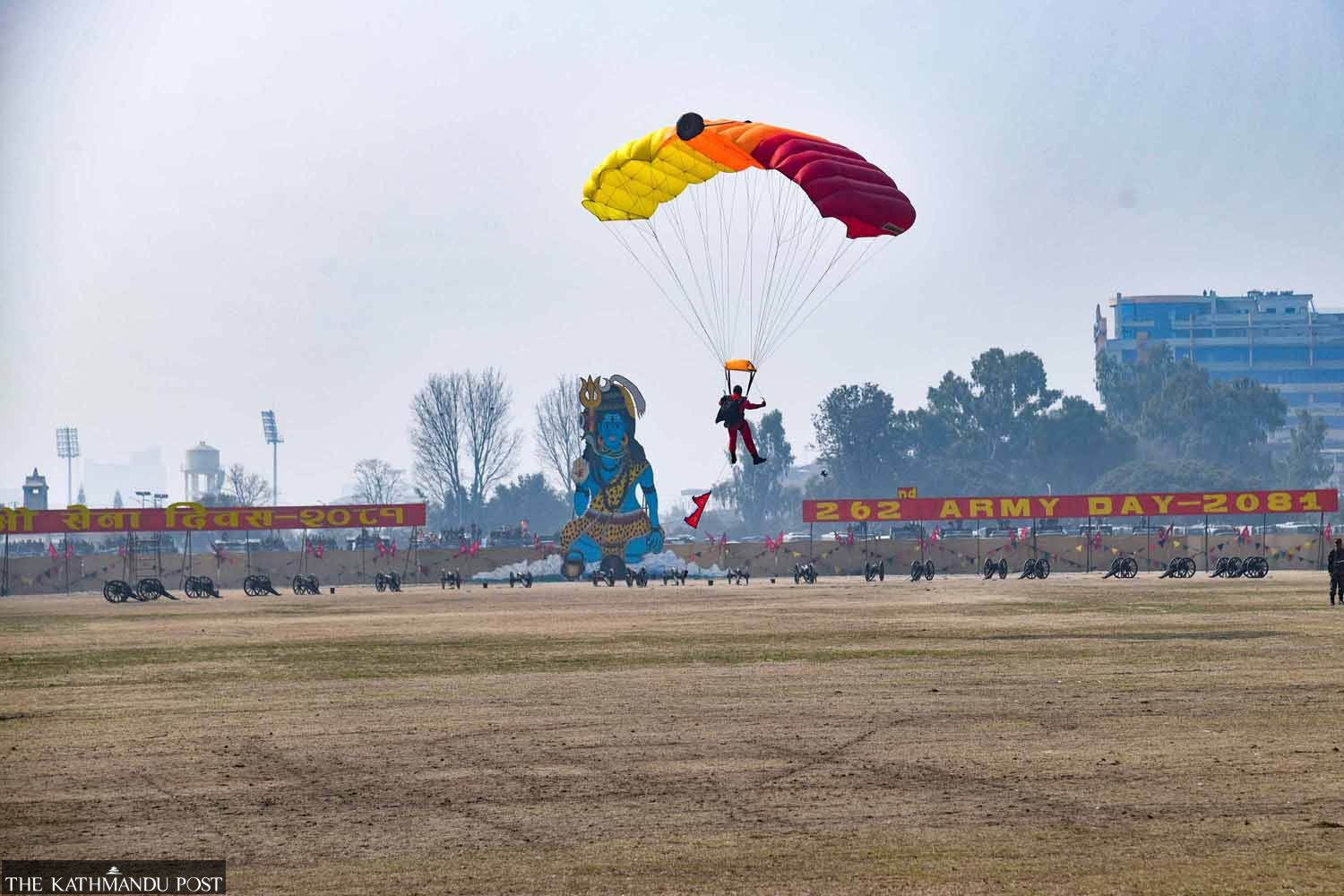 A Nepal Army paratrooper about to touch down in Tundikhel parade ground, with a giant image of Shiva in the background on Wednesday during the Army Day celebrations. Deepak KC/TKP