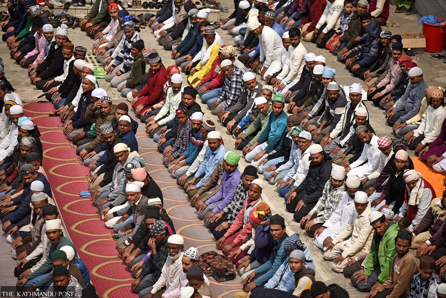 Muslim men pray at the Kashmiri Masjid in Ghantaghar, Kathmandu on the first Friday of the Islamic fasting month of Ramadan. Angad Dhakal/TKP
