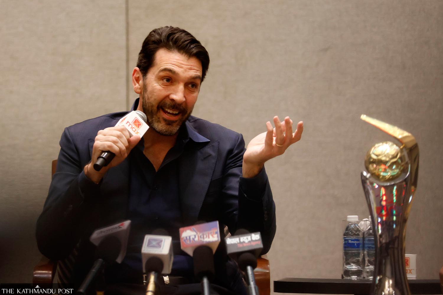 Italian footballer Gianluigi Buffon speaks at an interaction in Kathmandu on Sunday. Hemanta Shrestha/TKP