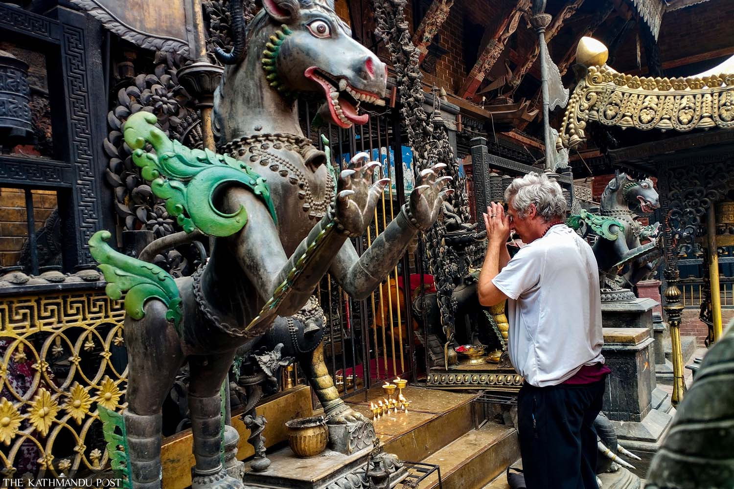 A tourist offers prayers at Rudravarna Mahavihar, a Buddhist monastery, in Patan, Lalitpur on Thursday. Deepak KC/TKP