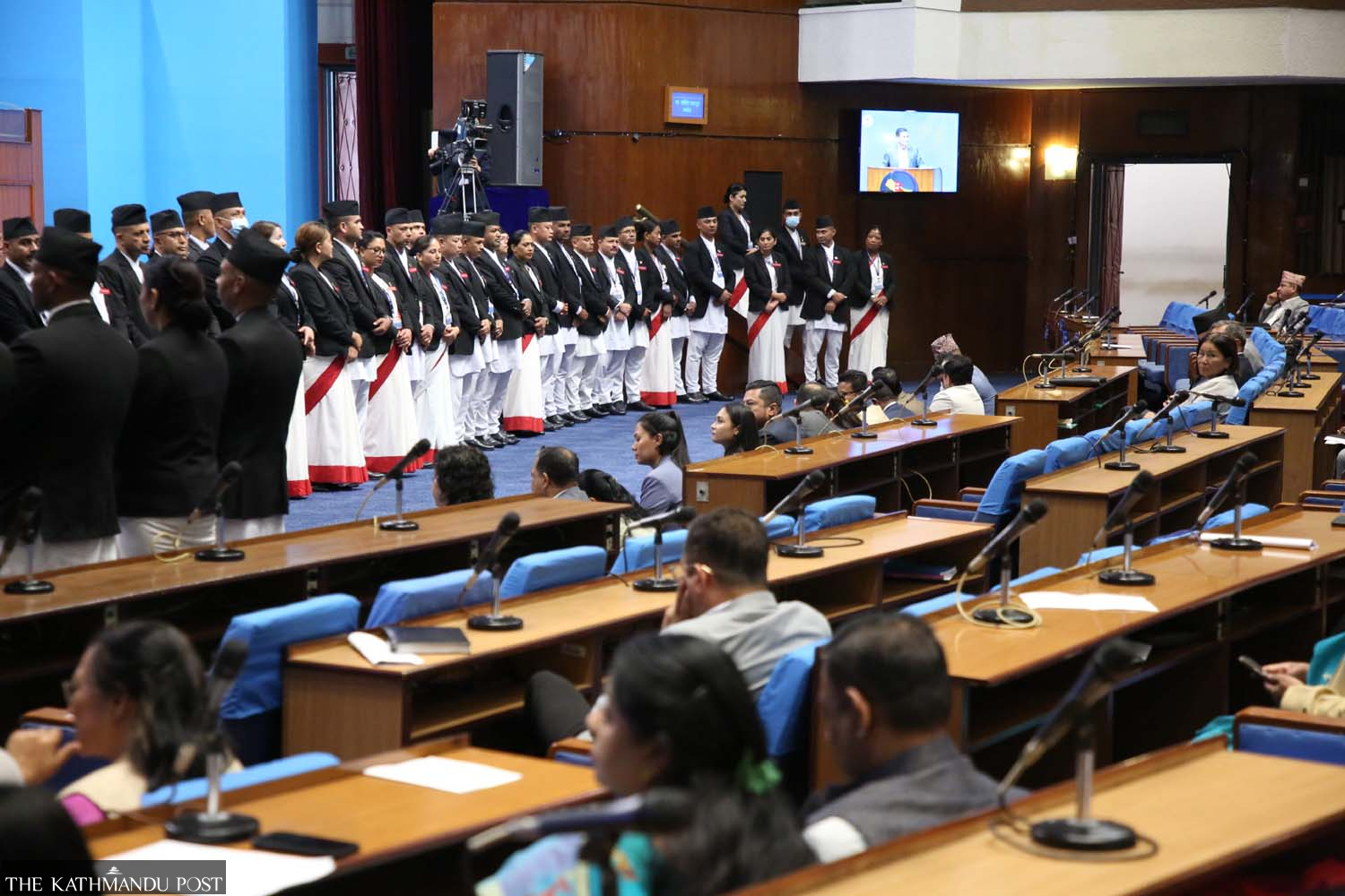 House proceedings continued on Monday despite protest by Rastriya Swatantra Party lawmakers, who are seen sitting on the floor of the well,with a row of marshals in front of them. The party is demanding resignation of Home Minister Ramesh Lekhak and investigation into his alleged involvement in a visit visa scam. Post Photo