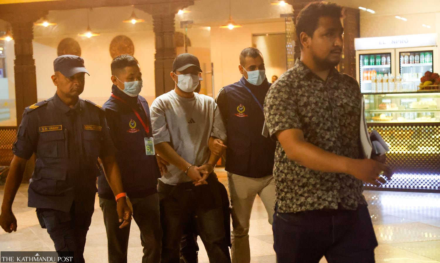 Jyoti Bahadur Bhandari, a suspect in embezzling deposits with the Miteri Cooperative, Lalitpur, is led out of the Tribhuvan International Airport in Kathmandu on Wednesday night. Nepal Police secured his repatriation from Cambodia with Interpol’s help to face justice in Nepal. Suryams Upreti/TKP