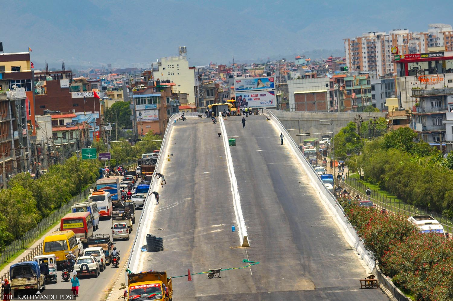 Workers paint the guardrails of the newly-built overpass at Gwarko in Lalitpur on Tuesday. The facility was inaugurated on Friday. Deepak KC/TKP