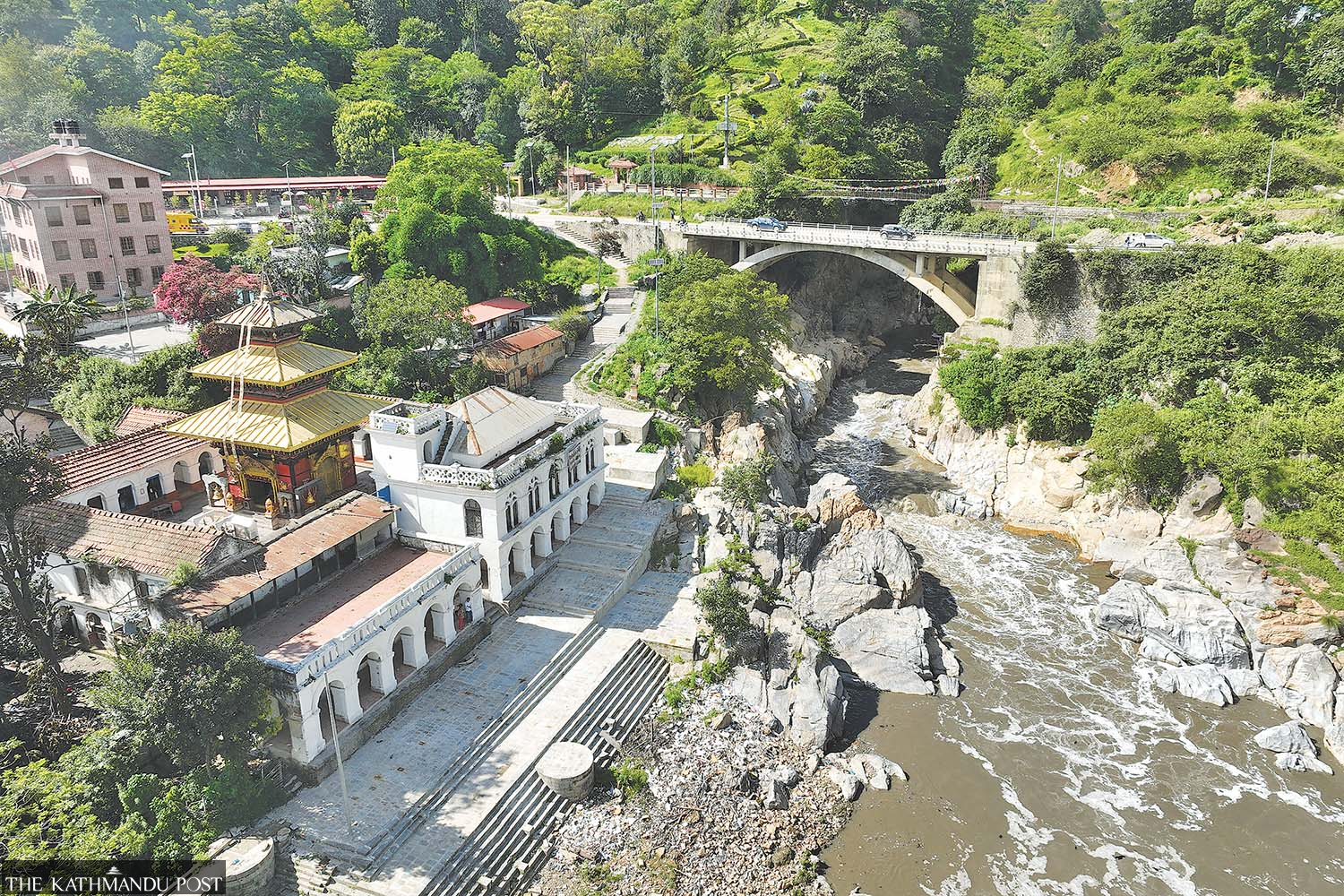 Bagmati water flows out of the Chobhar gorge and under the bridge in Kathmandu on Thursday. Authorities’ plan to widen the outlet to drain more floodwaters has drawn the flak of local residents and conservationists, who fear an assault on the archaeological site. Hemanta Shrestha/TKP