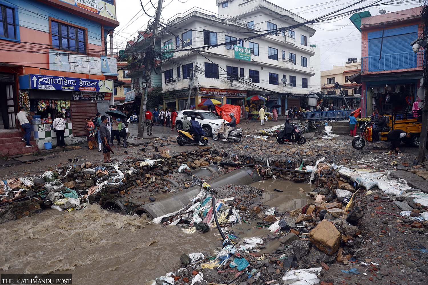 People and vehicles make their way along a flood-ravaged road with exposed drainage pipes, at Kapan in Budhanilakantha Municipality in northern Kathmandu, on Monday. The area, built over a seasonal spring, sees severe flooding every monsoon. Suryams Upreti/TKP