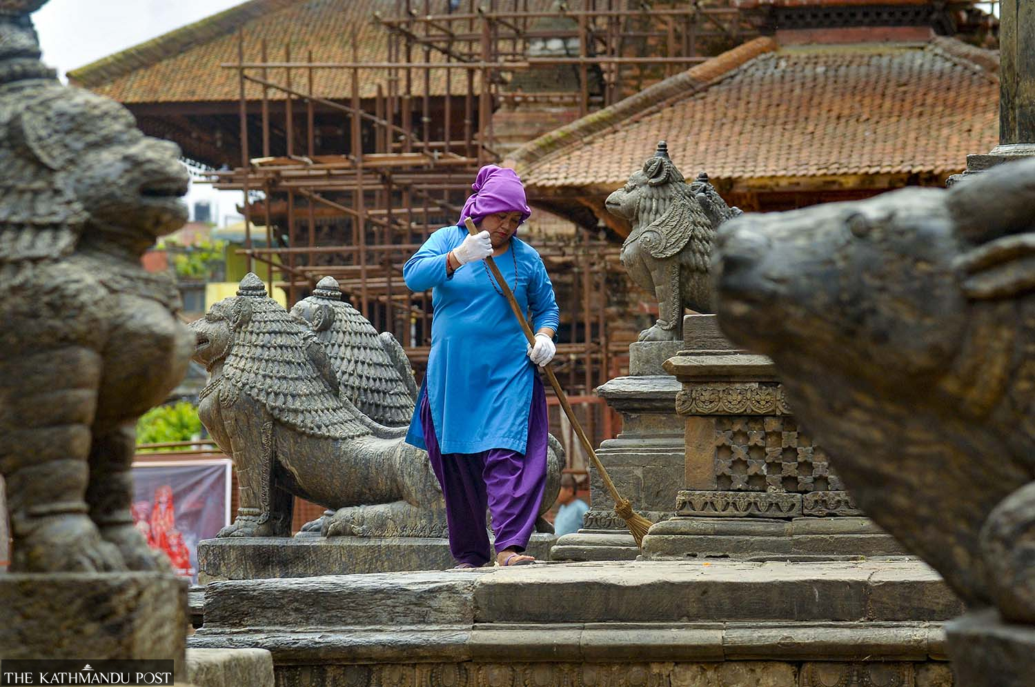 A municipal worker sweeps the floor at Patan Durbar Square on Tuesday. Deepak KC/TKP